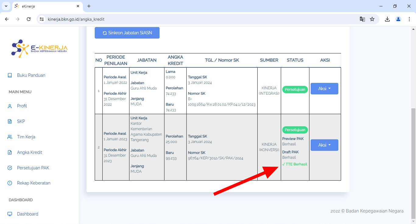 17. Jika tampilan seperti dibawah ini berarti pengajuan angka kredit sudah disetujui pejabat penilai kinerja namun belum diproses tandatangan elektronik (TTE).